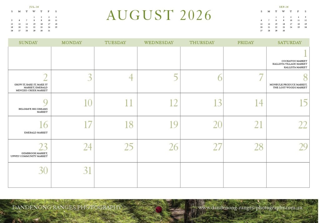 With large squares inside for writing on. It also lists all the local markets and other events happening in and around the Dandenong Ranges, so ideal for locals as well as showcasing our beautiful region to family and friends.